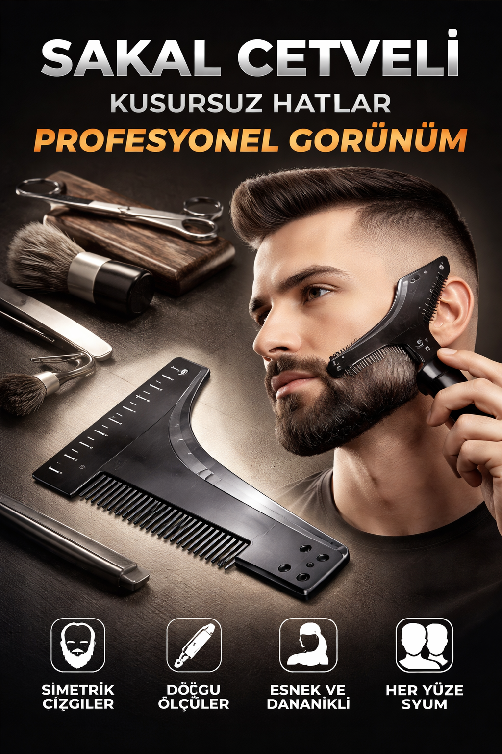 Sakal cetveli, evde tıraşı zahmetsiz ve kusursuz hale getirir. Yanak, boyun ve çene çizgilerini tek hamlede netleştirerek berberden çıkmış gibi bir görünüm sağlar. Simetrik hatlar, temiz çizgiler ve profesyonel sonuç isteyenler için ideal bir çözümdür. Zamandan tasarruf et, her tıraşta kendinden emin görün.